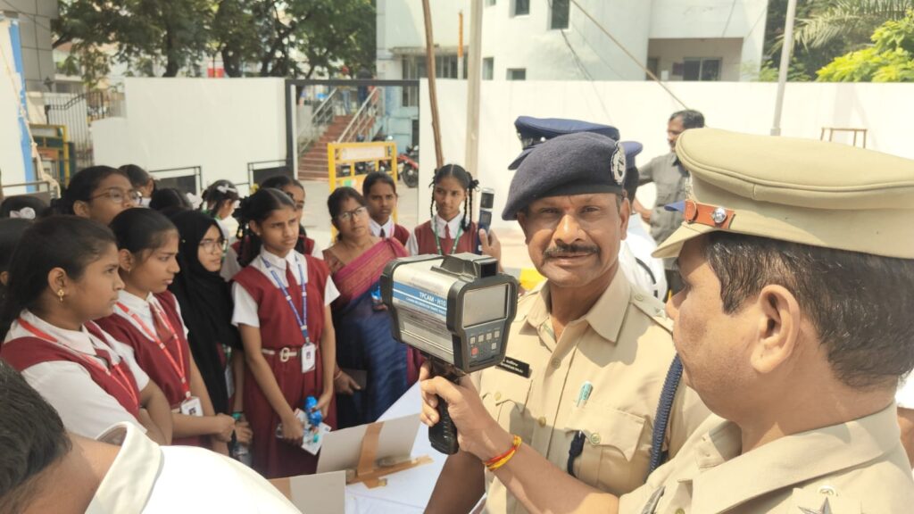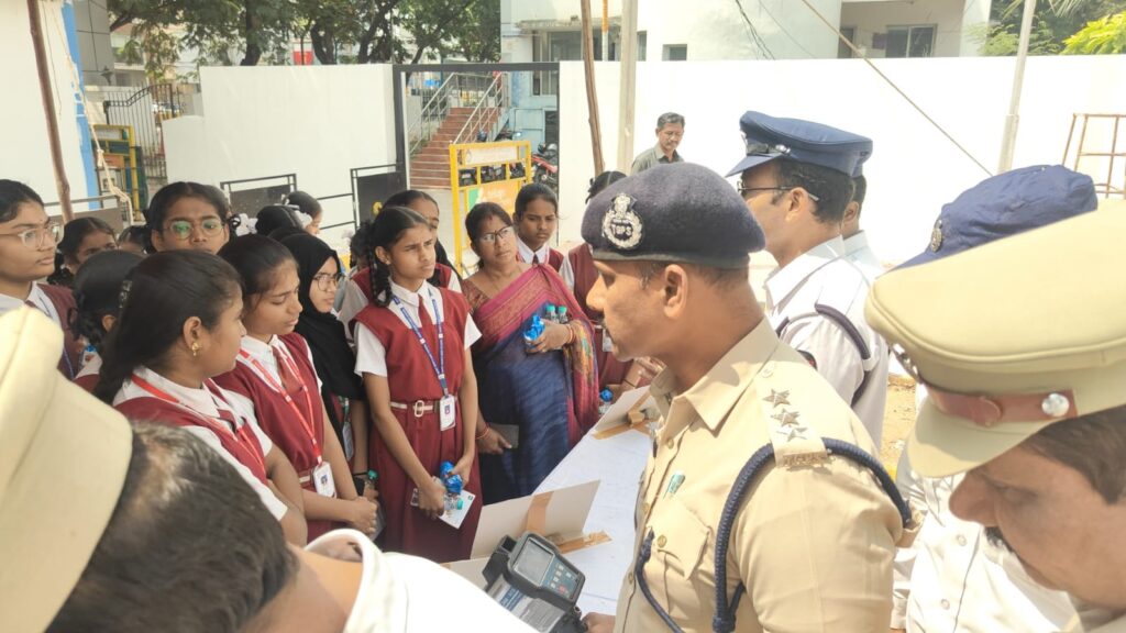 ట్రాఫిక్ సిబ్బంది విద్యార్థులకు వారు వినియోగించే వాహనలు,ట్రాఫిక్ లేజర్ కెమెరాలు ,బాడి కెమెరాలతో పాటు చాలన్ జనరేట్ అయ్యే విధానంను తెలియజేసారు..పోలీసు అమరవీరుల సంస్మరణ దినోత్సవం పురస్కరించుకోని ఉన్నత అధికారుల ఆదేశాలతో ప్రత్యేకంగా ఈ కార్యక్రమంను నిర్వహించమని టిటిఐ ఎసిపి లక్ష్మణ్ తెలిపారు. ఈ అవగాహనా కార్యక్రమంలో నార్త్ జోన్ ట్రాఫిక్ 1 ఏ సి పి శంకర్ రాజు ఇన్స్పెక్టర్లు,ఎస్సైలు సిబ్బంది,విద్యార్ధినీ ,విద్యార్థులు పాల్గొన్నారు.