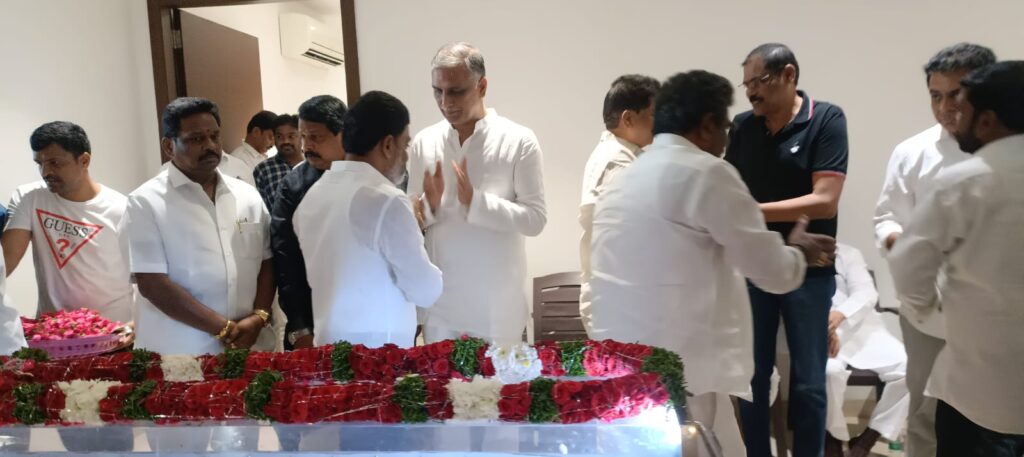 కూకట్పల్లి నియోజకవర్గం ఎమ్మెల్యే మాధవరం కృష్ణారావు,మేడ్చల్ మల్కాజ్గిరి పార్లమెంట్ ఇంచార్జ్ రాగిడి లక్ష్మారెడ్డి,ఓల్డ్ బోయిన్పల్లి 119 డివిజన్ కార్పొరేటర్ ముద్దం నరసింహయాదవ్ ,మూసాపేట్ మాజీ కార్పొరేటర్ తూము శ్రవణ్ కుమార్కూకట్పల్లి నియోజకవర్గం కోఆర్డినేటర్ సతీష్ అరోరా ఓల్డ్ బోయిన్పల్లి డివిజన్ అధ్యక్షులు ఇర్ఫాన్ భాయ్ సెక్రెటరీ హరినాథ్ బుర్రి యాదగిరి చందు యాదవ్ వారి పార్దవ దోహానికి పూలమాలవేసి శ్రద్ధాంజలి ఘటించారు.వారి కుటుంబ సభ్యులకు ,హరీష్ రావుకు ప్రగాఢ సానుభూతి తెలియ జేశారు.