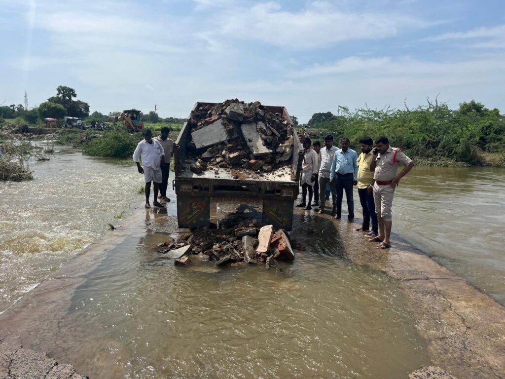 మొంథా తుఫాన్ ప్రభావం వల్ల ఉదృతంగా దోర్నపువాగు ప్రవహించటంతో తాళ్లూ రు-కుంకుపాడు మార్గంలోగల దోర్నపు బ్రిడ్జి పై ఏర్పడ్డ పెద్దగుంటను ఎస్సై మల్లికార్జునరావు యుద్ద ప్రాతి పదికన పూడ్పించి వాహన రాకపోకలకు ఇబ్బం దులు లేకుండా చర్యలు చేపట్టారు. వాగు ఉధృతి తగ్గడంతో బ్రిడ్జి పైనుండి మోటార్ వాహనా లపై రాకపోకలు గురువారం సాగించటం మొదలుపెట్టారు. తాళ్లూరు నుండి వెళ్లే మార్గం లో చప్టా పై 5 అడుగుల వెడల్పు, మూడు అడుగులలోతు గల పెద్ద గుంట ఏర్పడి ప్రమాధకరంగా వుండటాన్ని తెలుసుకున్న ఎస్సైమల్లి ఖార్జునరావు వెంటనే ప్రొక్లెయిన్ యజమాని మిట్టా శ్రీనుతో మాట్లాడి గుంటపూడ్చేందుకు ప్రొక్టెయిన్ ఏర్పాటు చేయించారు. నిత్యం ఆమార్గంలో గుండా పొలాలకు వెళ్లే రైతు, వైసిపి నేత కోట క్రిష్ణారెడ్డి టాక్టర్ ట్రాలీ సమకూర్చగా వాగు పక్క వున్న రాళ్ల మట్టిని ప్రొక్లెయిన్ తో ఎత్తించి ఎస్సై దగ్గరుండి గుంతనుపూడ్పించారు. ప్రమా.