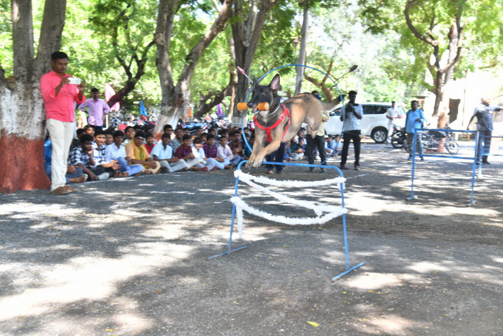 విన్యాసాలులో భాగంగా ముందుగా జిల్లా ఎస్పీ కి చీటా, జాకీ జాగిలాలు గౌరవ వందనం చేశాయి. ఆ తర్వాత జాకీ జాగిలం తన కర్తవ్య నిర్వహణలో భాగంగా ఎన్ని అడ్డంకులు ఎదురైనా దాటకుంటూ లక్ష్యాన్ని ఛేదించేందుకు ఉపయోగపడే హార్డిల్స్ జంపు విన్యాసాలు విద్యార్థులను ఎంతగానే అబ్బురపరిచాయి. ఈ జాగిలాలు పేలుడు పదార్థాలు మరియు హత్యలు, దొంగతనాలు జరిగిన సందర్భాలలో నిందితులను గుర్తించడం కోసం జాగిలాలు విధులు నిర్వహిస్తాయి.