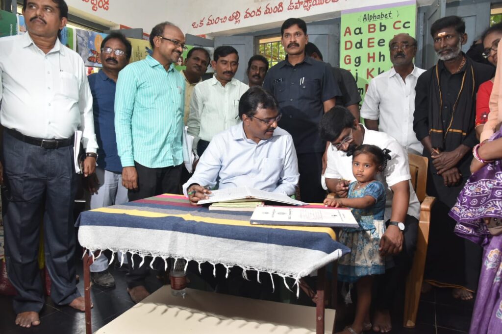 అదే ప్రాంగణంలో ఉన్న అంగన్వాడీ కేంద్రాన్ని కూడా కలెక్టర్, ఎమ్మెల్యే సందర్శించారు. అంగనవాడి రికార్డులను పరిశీలించి, చిన్నారుల ఆరోగ్య వివరాలపై ఆరా తీశారు. వారికి అందిస్తున్న ఆహారము, వయసుకు తగినట్లుగా బరువు, ఎత్తును స్వయంగా పరిశీలించారు. మెనూ ప్రకారం భోజనం పెట్టాలని సిబ్బందికి స్పష్టం చేశారు. అనంతరం పాఠశాలలో విద్యార్థులతో కలిసి వారు మధ్యాహ్న భోజనము తిన్నారు. అన్నం సరిగా ఉడకపోవడాన్ని