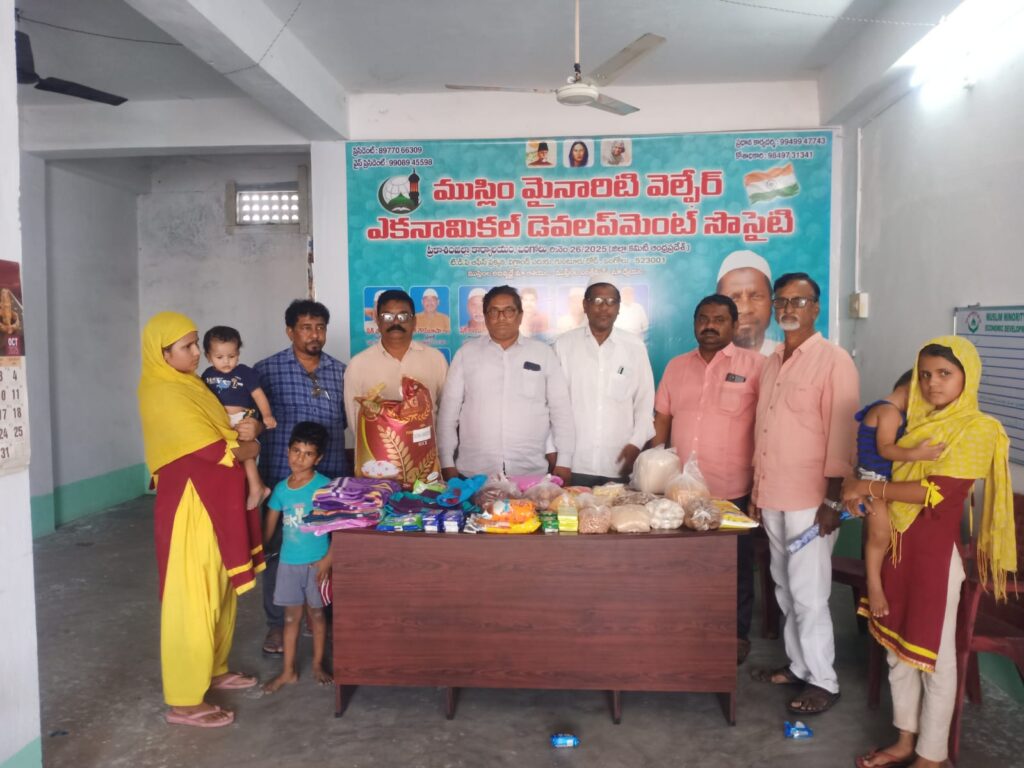 ఒంగోలు నగరం గుంటూరు రోడ్డు లోని లారీలకుంటలో నివాసం ఉంటున్న బీహార్ వాసి షేక్ దిల్షాద్ అనారోగ్యం బారినపడి రిమ్స్ హాస్పిటల్లో చికిత్స పొందుతున్నారు. ఆయనకు భార్య, నలుగురు కుమారులు. రోజూ కూలికి వెళ్తే గాని పూట గడవని నిరుపేద దిల్షాద్ అనారోగ్యంతో రిమ్స్ హాస్పిటల్ చికిత్స పొందుతూ ఉండడంతో ఇంట్లో గడవడం కూడా కష్టంగా ఉందని తెలుసుకున్న ప్రకాశం జిల్లా ముస్లిం మైనారిటీ వెల్ఫేర్ ఎకనామికల్ డెవలప్మెంట్ సొసైటీ నాయకులు స్పందించి దిల్షాద్ భార్య ఆయేషాకు రెండు నెలలకు సరిపడా నిత్యావసర వస్తువులను, దుప్పట్లు, బట్టలను అందజేశారు. ఈ కార్యక్రమానికి ముఖ్య అతిథిగా పాల్గొన్న తెలుగుదేశం పార్టీ రాష్ట్ర మైనారిటీ సెల్ నాయకులు పఠాన్ హనీఫ్ ఖాన్ మాట్లాడుతూ ముస్లిం మైనారిటీ వెల్ఫేర్ ఎకనామికల్ డెవలప్మెంట్ సొసైటీ సభ్యులు నిరుపేదలకు