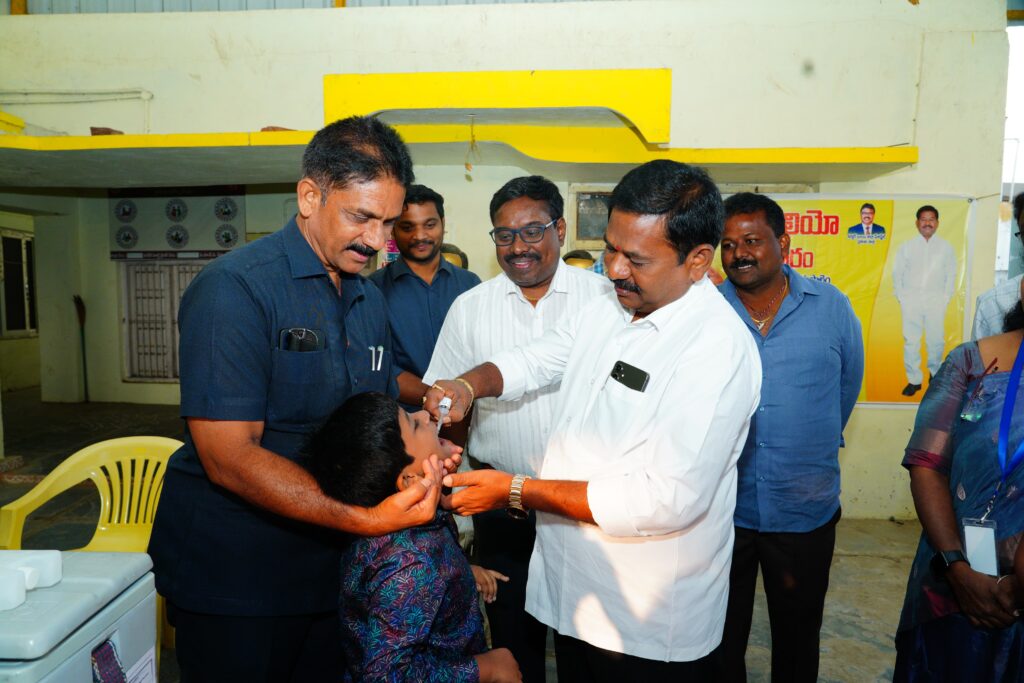 ఐదేళ్లలోపు పిల్లలందరికీ పోలియో చుక్కలు వేయించి పోలియో రహిత సమాజానికి కృషి చేద్దామని రాష్ట్ర సాంఘిక సంక్షేమ శాఖ మంత్రి డా. డోలా బాల వీరాంజనేయస్వామి పిలుపునిచ్చారు. ఆదివారం ప్రకాశం జిల్లా టంగుటూరు మండలం తూర్పు నాయుడుపాలెం పంచాయితీ కార్యాలయంలో చిన్నారులకు పోలియో చుక్కలు వేసి మంత్రి జిల్లాలో కార్యక్రమాన్ని ప్రారంభించారు. ఈ సందర్బంగా ఆయన మాట్లాడుతూ…ఐదేళ్లలోపు పిల్లలందరికీ తప్పనిసరిగా పోలియో చుక్కలు వేయించాలి. తల్లి తండ్రులు బాధ్యతగా చిన్నారులకు పోలియో చుక్కలు వేయించి వారు భవిష్యత్తులో పోలియో వ్యాధి భారిన పడకుండా కాపాడుదాం. వైద్య ఆరోగ్య సిబ్బంది జిల్లాలో ప్రతి ఇంటికి వెళ్లి 5 ఏళ్ల లోపు చిన్నారులందరికీ తప్పనిసరిగా పోలియో చుక్కలు వేయాలి. జిల్లాలో 100% పల్స్ పోలియో కార్యక్రమాన్ని పూర్తి చేయాలని అధికారులను మంత్రి డా. డోలా బాల వీరాంజనేయస్వామి ఆదేశించారు.