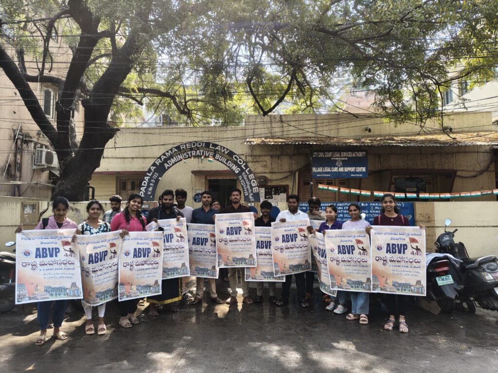 అఖిల భారతీయ విద్యార్థి పరిషత్-సికింద్రాబాద్ జిల్లా, అమీర్ పేట్ శాఖ ఆధ్వర్యంలోపడాల రామారెడ్డి లా కాలేజీలో 44వ రాష్ట్ర మహాసభల గోడ పత్రికను ఆవిష్కరించారు.ఈ సందర్భంగా వారు మాట్లాడుతూ నిరంతర ఉద్యమాలతో విద్యార్థుల సమస్యలపై గళమెత్తుతున్న ఏకైక విద్యార్థి సంఘం అఖిల భారతీయ విద్యార్థి పరిషత్ అని అన్నారు.జనవరి 3,4,5 తేదీలలో శంషాబాద్ లో రాష్ట్ర మహాసభలను నిర్వహించడం జరుగుతోందన్నారు. ఈ మహాసభల్లో దాదాపు 800మంది విద్యార్థి నాయకులు, ప్రొఫెసర్లు, ప్రముఖులు, రాష్ట్ర నలుమూలల నుంచి విద్యార్థి నాయకులు హాజరవుతారని తెలిపారు. విద్యారంగ సమస్యలపైన, విద్యారంగస్థితి, రాష్ట్ర సమస్యలు, పర్యావరణ పరిరక్షణ, డ్రగ్స్ మహమ్మారి నిర్మూలన తదితర అంశాలపై తీర్మాణాలు చేయనున్నట్లు ప్రకటించారు. జిల్లాలోని విద్యార్థి నాయకులు మహాసభలకు తరలివచ్చి విజయవంతం చేయాలని పిలుపునిచ్చారు. ఈ కార్యక్రమంలో హైదరాబాద్ మహానగర్ లా ఫోరమ్ కో కన్వీనర్ మిద్దెల గౌతమ్ రెడ్డి, జిల్లా కలమంచ్ కన్వీనర్ దిలీప్, శివరాజ్ ,పడాల రామా రెడ్డి లా కాలేజీ కార్యదర్శి రామ చేతన్ , మరియు ఇతర కార్యకర్తలు పాల్గొన్నారు.