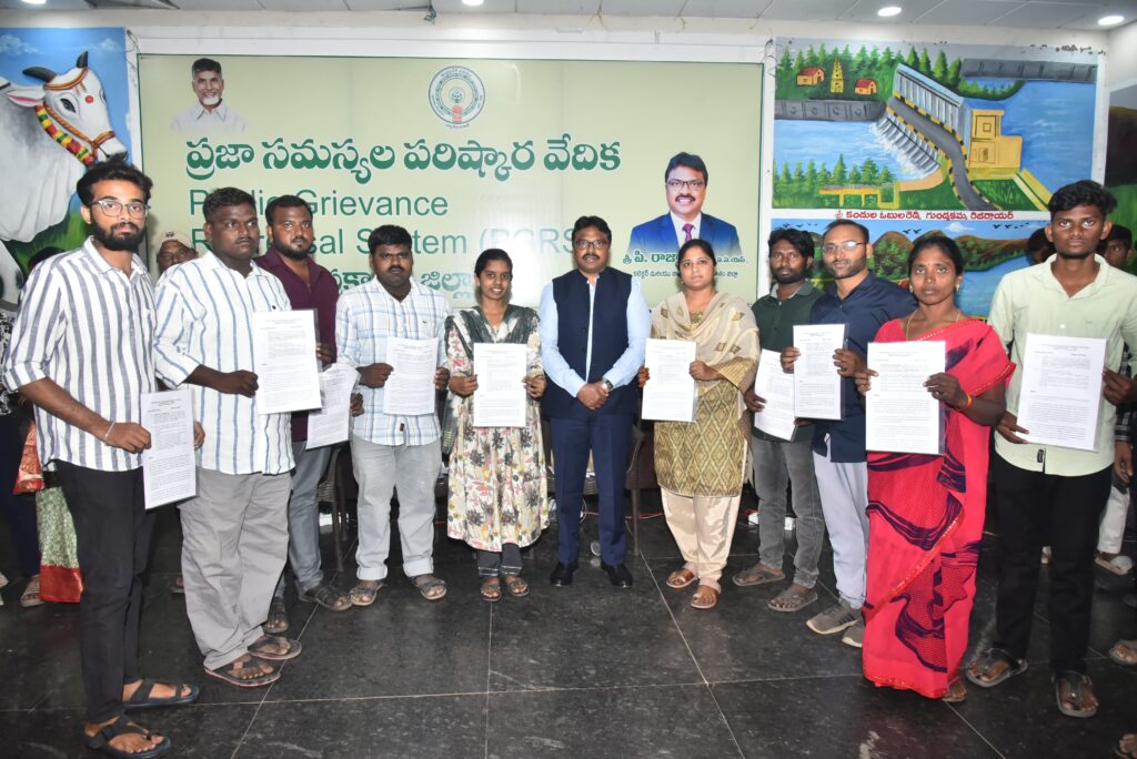 పొందిన 8 మందికి, ఎస్సీ ఎస్టీ అత్యాచార నిరోధక చట్టం కింద పరిహారంలో భాగంగా ఉద్యోగాలు పొందిన ఇద్దరికి సోమవారం గ్రీవెన్స్ హాలులో ఆయన నియామక పత్రాలు అందించారు. ప్రభుత్వ సర్వీసులోకి వస్తున్నందుకు అభినందిస్తూ, విధుల నిర్వహణలో నైపుణ్యం పెంచుకొని ఉన్నత స్థానాలకు ఎదగాలని సూచించారు. ఈ కార్యక్రమంలో కలెక్టరేట్ పరిపాలన అధికారి రవి, ఇతర అధికారులు పాల్గొన్నారు.