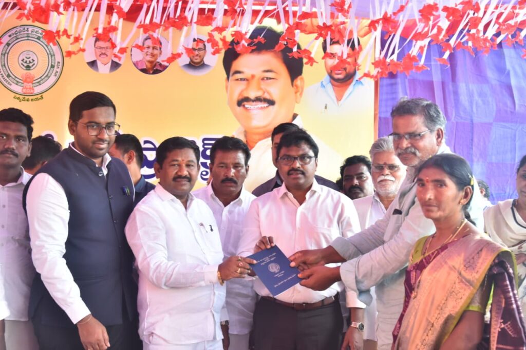 అన్నారు. మంగళవా రం కొండేపి నియోజ కవర్గం పొన్నలూరు మండలం వెల్లటూరు గ్రామంలో రాష్ట్ర సాంఘిక సంక్షేమశాఖ మంత్రి డోలా బాల వీరాంజనే యస్వామి, జిల్లా కలెక్టర్ పి.రాజ బాబు రైతులకు కొత్త పాస్ పుస్తకాలను పంపిణీ చేశారు. ఈ సందర్భంగా రాష్ట్ర సాంఘికసంక్షేమశాఖ మంత్రి డోలా బాల వీరాంజనేయస్వామి మాట్లాడుతూ రాష్ట్రం లోభూహక్కులకు సంబంధించి21లక్షల మంది రైతులకు కొత్త పాస్ పుస్తకాలను ప్రభుత్వం పంపిణీ చేయడానికి చర్యలు తీసుకుందని అన్నారు. రాష్ట్రంలో రీ సర్వే పూర్తి చేసిన గ్రామాల లో కొత్తగా రైతులకు రాజముద్ర కలిగిన పట్టాదార్ పాస్ పుస్త కాలనుపంపిణీ చేయ డానికి ప్రభుత్వం చర్యలుతీసుకుంద న్నారు. భూమి హక్కులకు సంబంధించిన పట్టాదార్ పాస్ పుస్తకం రైతులకు హక్కుగా ప్రభుత్వం కల్పించింద న్నారు. గత ప్రభుత్వంలో పాలకులు పాసు పుస్తకాలపై వ్యక్తిగత ఫోటోలను ముద్రించి రైతులకు పంపిణీ చేయడంజరిగింది అన్నారు. రాష్ట్ర ముఖ్యమంత్రి నారా చంద్రబాబునాయుడు అధికారంలోకి వచ్చిన వెంటనే రైతులకు సమస్యలను పరిష్క రించడానికి చర్యలు తీసుకుంటామని హామీ ఇచ్చారని ఆయన చెప్పారు. ముఖ్యమంత్రి ఇచ్చిన హామీల మేరకు రాష్ట్రంలో రీ సర్వే చేపట్టి పారదర్శకంగా రైతులందరికీ పట్టాదార్ పాస్ పుస్తకాలను పంపిణీ చేయడం జరుగు తుందని ఆయన చెప్పారు. పట్టాదార్ పాస్ పుస్తకాల్లో ఉన్న క్యూ ఆర్ కోడ్ ను స్కాన్ చేసిన వెంటనే రైతులకు సంబంధించిన భూముల వివరాలు, హద్దులు వెంటనే తెలుసు కోవచ్చునని ఆయన చెప్పారు. రాష్ట్రంలో రైతులు సంబంధించి 22ఏ నిషేధ జాబితాలో ఉన్న 5 రకాల భూములను తొలగించడానికి ప్రభుత్వం చర్యలు తీసుకుందని మంత్రి ఈ సందర్భంగా చెప్పారు. రాబోయే రోజుల్లో ఇనాం భూములు,అసైన్మెంట్ భూములు నిషేధిత జాబితా నుండి తొలగించడానికి ప్రభుత్వంత్వరలో చర్యలు తీసుకో బోతుందని ఆయన చెప్పారు. కొండేపి నియోజకవర్గంలో రైతులు ఎదుర్కొంటు న్న సమస్యలను తొలగించడానికి ప్రతి మండలంలో రెవెన్యూ క్లినిక్ లను నిర్వహించ వలసిందిగా కలెక్టర్ కు సూచించామన్నారు. రాష్ట్రంలోమహిళలకోసం శ్రీశక్తి పధకం క్రింద ఉచిత బస్సు సౌకర్యం అందుబాటు లో తీసుకొచ్చామన్నారు. అలాగే తల్లికి వందనం కార్యక్రమం క్రింద ఎంతమంది పిల్లలు ఉంటే అంత మంది పిల్లలు కూడా తల్లికి వందనం క్రింద నగదు జమ చేస్తున్నా మని ఆయన చెప్పారు. ముఖ్యమంత్రి ఇచ్చిన హామీ మేరకు మహిళలకు ఉచితంగా మూడు గ్యాస్ సిలిండర్లను ప్రతి ఇంటికి పంపిణీ చేస్తున్నామని మంత్రి చెప్పారు. గృహ నిర్మాణాలను పూర్తి చేసుకున్న లబ్ధిదారుల కు బిల్లులు వెంటనే చెల్లిస్తామని మంత్రి చెప్పారు. కొత్తగా మంజూరైన గృహాలను ఫిబ్రవరి మాసం నుండి ప్రారంభించడానికి చర్యలు తీసుకోవాలని ప్రజలకు చెప్పారు. ఈ సమావేశంలో పాల