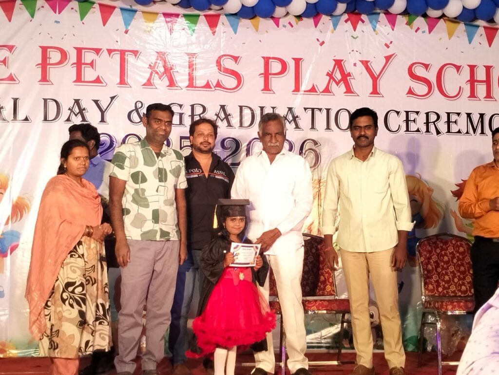 చిన్నారుల ప్రతిభ ను ఉపాధ్యాయులు గుర్తించి , వారి భవిష్యత్ కు పునాదులు వేయాలని, కంటోన్మెంట్ బోర్డు మాజీ ఉపాధ్యక్షులు జంపన ప్రతాప్ అన్నారు. బోయిన్ పల్లి లో రోజ్ పెటల్స్ స్కూల్ వార్షికోత్సవ , గ్రాడ్యుయేషన్ డే వేడుకలు ఘనంగా జరిగాయి. ఈ కార్యక్రమానికి ముఖ్యఅతిథిగా జంపన ప్రతాప్ హాజరయ్యారు. ఈ సందర్భంగా ఆయన మాట్లాడుతూ. చిన్నారులుఏ సబ్జెక్టు ల లో ఆసక్తి కలిగి ఉన్నారో గమనించి ఉపాధ్యాయులు వారిని ఆయా సబ్జెక్టుల లో ప్రోత్సహించాలని జంపన అన్నారు. విద్యతో పాటు వారికి ఆసక్తి ఉన్న క్రీడలు, డ్రాయింగ్, ఎస్ ఏ రైటింగ్ వాటిలోప్రోత్సహించాలన్నారు. ఈ సందర్భంగా పాఠశాలలో విద్యార్థులకు పలు రంగాల్లో నిర్వహించిన పోటీలలో విజేతలకు బహుమతులు మెడల్స్ ను అందజేశారు.ఈ కార్యక్రమంలో పాఠశాల డైరెక్టర్ శ్రీనివాస్, ఎగ్జిక్యూటివ్ డైరెక్టర్ భరత్ ప్రసాద్ మిశ్రా, ఉపాధ్యాయులు గీత, సుప్రియ, జ్యోతి, రాధిక విద్యార్థిని, విద్యార్థులు వారి తల్లిదండ్రులు పాల్గొన్నారు.