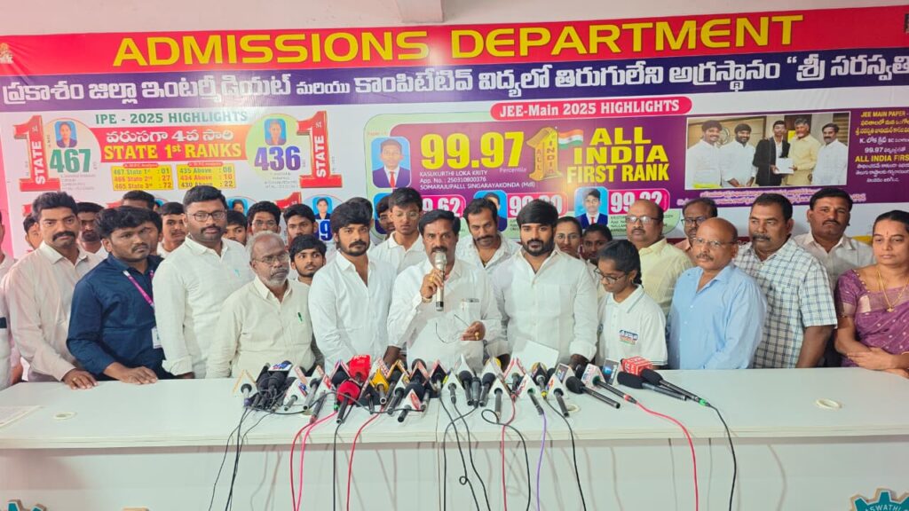 సామాన్య విద్యార్థులతో కార్పోరేట్ స్థాయి ఫలితాలు సాధిస్తూ జిల్లాలో శ్రీ సరస్వతి విద్యా సంస్థలు సంచలన ఫలితాలు వరుసగా సాధిస్తున్నాయని ఆ సంస్థ చైర్మన్ ఎవీ రమణా రెడ్డి తెలిపారు. శ్రీ సరస్వతి విద్యా సంస్థ జెఈ మెయిన్స్లో వై రిషిత్ కుమార్ రెడ్డి 99.56 సాధించి టాప్ పర్సంటైల్లో నిలిచిన సందర్భంగా మంగళవారం విలేకరుల సమావేశం ఏర్పాటు చేసి ప్రతిభ చాటిన విద్యార్థులను సన్మానించారు. ఈ సందర్భంగా చైర్మన్ ఎవీ రమణా రెడ్డి మాట్లాడుతూ సరస్వతి విద్యా సంస్థలు ఒంగోలులో ఇంటర్మీడియట్ స్థాపించక ముందు విజయవాడ, గుంటూరు వంటి పట్టణాలలో కార్పోరేట్ విద్యా సంస్థలలో తల్లిదండ్రులకు తమ పిల్లలను చేర్పించి అధిక ఫీజులు చెల్లించి ఇబ్బందులు పడుతున్న సమయంలో తల్లిదండ్రుల ఆకాంక్షలను నేరవేర్చేందుకు తమ విద్యా సంస్థ ఇంటర్మీడియట్ను స్ధాపించినట్లు చెప్పారు. స్థాపించిన నాటి నుండి డైరెక్టర్లు గణేష్ రెడ్డి, శంకర్ రెడ్డి లు ప్రతి విద్యార్థి పట్ల వ్యక్తి గత శ్రర్థతో ఉత్తమ ఫలితాలు సాధింస్తున్న తీరు విద్యార్థుల పట్ల తాము తీసుకుంటున్న ప్రత్యేక శ్రర్థకు నిదర్శమన్నారు. ముఖ్యంగా డైరెక్టర్లు గణేష్ రెడ్డి, శంకర్ రెడ్డిలు డీన్స్, ప్రిన్సిపాలన్ను కో ఆర్డినేషన్ చేసుకుంటూ ప్రతి విద్యార్ధి ప్రొగెన్పై ప్రత్యేక శ్రర్థ వహించటం వలననే మంచి రిజల్స్ సాధించినట్లు వివరించారు. తమకు సహకరిస్తున్న విద్యార్థుల తల్లిదండ్రులకు, విద్యా సంస్థల యాజమాన్యాలను, మీడియా మిత్రులకు కృతజ్ఞతలు తెలిపారు. ఉత్తమ ప్రతిభ చాటివ జిల్లాలో ప్రథమ, ద్వితీయ, తృతీయ, చతుర్థ స్థానాలలో నిలిచిన వై రిషిత్ కుమార్ రెడ్డి (99.56) పర్సంటైల్, ఎం . వెంకట విష్ణు (98.26) పర్సంటైల్, ఎల్ వెంకటేశ్వర రెడ్డి (97.82) పర్సంటైల్, కె అవినాష్ రెడ్డి (97.37) పర్సంటైల్ లను అభినందించారు.