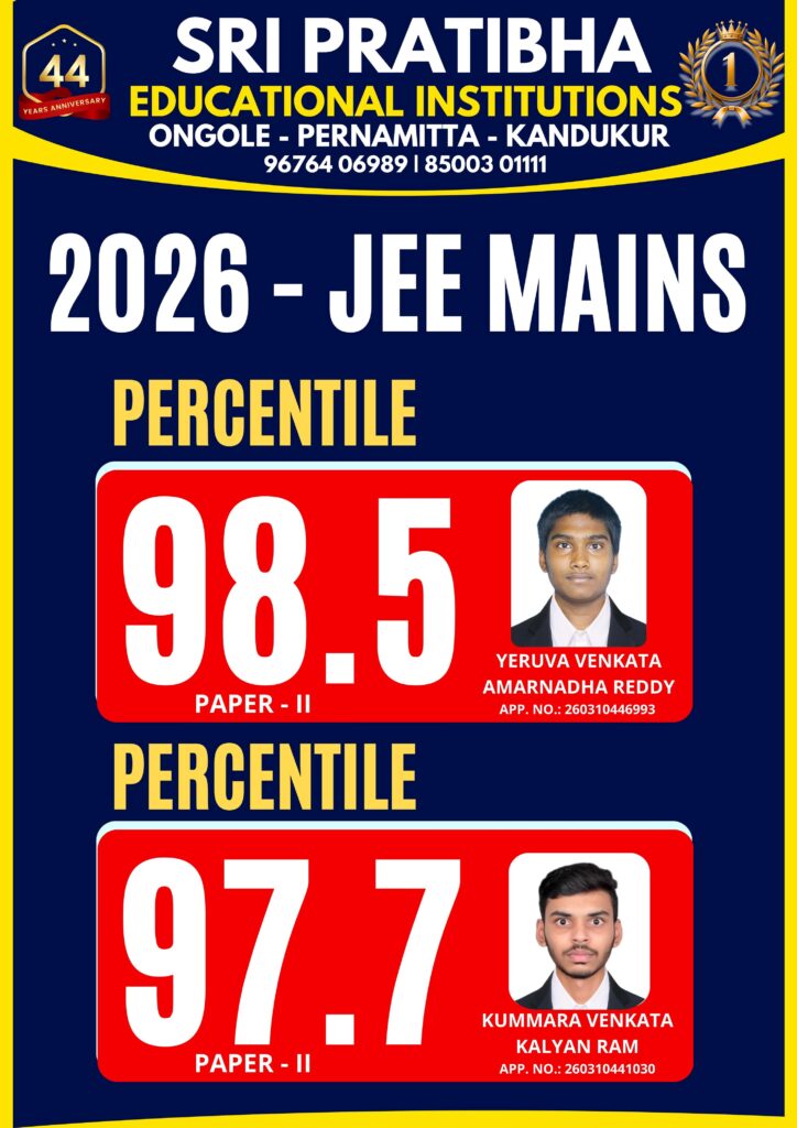 మంగళవారం విడుదలైన జేఈఈ మెయిన్స్ 2026 పేపర్ 2 పరీక్ష ఫలితాలలో శ్రీ ప్రతిభ విద్యార్థులు ప్రభంజనం సృష్టించారు. శ్రీ ప్రతిభ విద్యాసంస్థలకు చెందిన ఏరువ వెంకట అమర్నాథ్ రెడ్డి ( 98.5) పర్సంటైల్, కుమ్మర వెంకట కళ్యాణ్ రామ్ (97.72) పర్సంటైల్ సాధించినట్లు శ్రీ ప్రతిభ విద్యాసంస్థల చైర్మన్ నల్లూరి వెంకటేశ్వర్లు పేర్కొన్నారు. ఈ సందర్భంగా కళాశాలలో ఏర్పాటుచేసిన అభినందన సభలో అత్యుత్తమ పర్సంటైల్ సాధించిన విద్యార్థులను శ్రీ ప్రతిభ విద్యాసంస్థల చైర్మన్ నల్లూరి వెంకటేశ్వర్లు, వైస్ చైర్మన్ నల్లూరి సీతారామాంజనేయులు, సీఈవో నల్లూరి జయప్రకాష్ నారాయణ్ అభినందించారు.