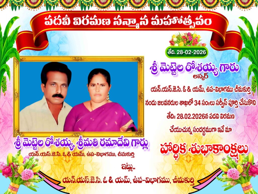 లష్కరుగా పనిచేసి శనివారం పదవీ విరమణ చేసిన తాళ్లూరు మండలం సోమవరప్పాడుకు చెందిన మెట్టెల రోశయ్య, ఆయన భార్య రమాదేవిలను చీమకుర్తిలోని ఎన్నెస్పీ కార్యాలయంవద్ద ఘనంగా సన్మా నించారు. ఆయన రైతులకోసం 34 సంవత్సరాలపాటు అందించిన సహాయ, సహకారాలను పలువురు వక్తలు వివరించి కొనియాడారు. ఇదే సందర్బంగా పదవీ విరమణ చేసిన లష్కరు మెట్టెల రోశయ్య దంపతులను కుటుంబీకులను కూడా సత్కరించారు. కార్యక్రమాల్లో డీఈఈ పి. గిరిబాబు, ఏఈఈలు కోటేశ్వరరావు, కిరణ్ కుమార్