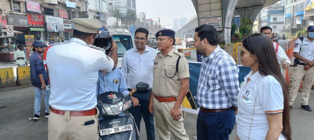 రోడ్డు భద్రతపై అవగాహన కల్పించడంతో పాటు, హెచ్ సి ఎస్ సి టీమ్, యంగ్ ఇండియా టీమ్ సహకారంతో అర్హులైన వాహనదారులకు 15 హెల్మెట్లను ఉచితంగా పంపిణీ చేశారు.ఈ కార్యక్రమంలో టోలిచౌకి ట్రాఫిక్ ఇన్స్పెక్టర్ జి. వెంకటేశ్వర్లు, ఖుల్సుంపురా ట్రాఫిక్ ఇన్స్పెక్టర్ ఎం. రాజేంద్ర ప్రసాద్ మరియు సిబ్బంది పాల్గొన్నారు. ప్రజలందరూ ట్రాఫిక్ నిబంధనలు పాటించి సురక్షిత ప్రయాణాన్ని సాగించాలని అధికారులు కోరారు.