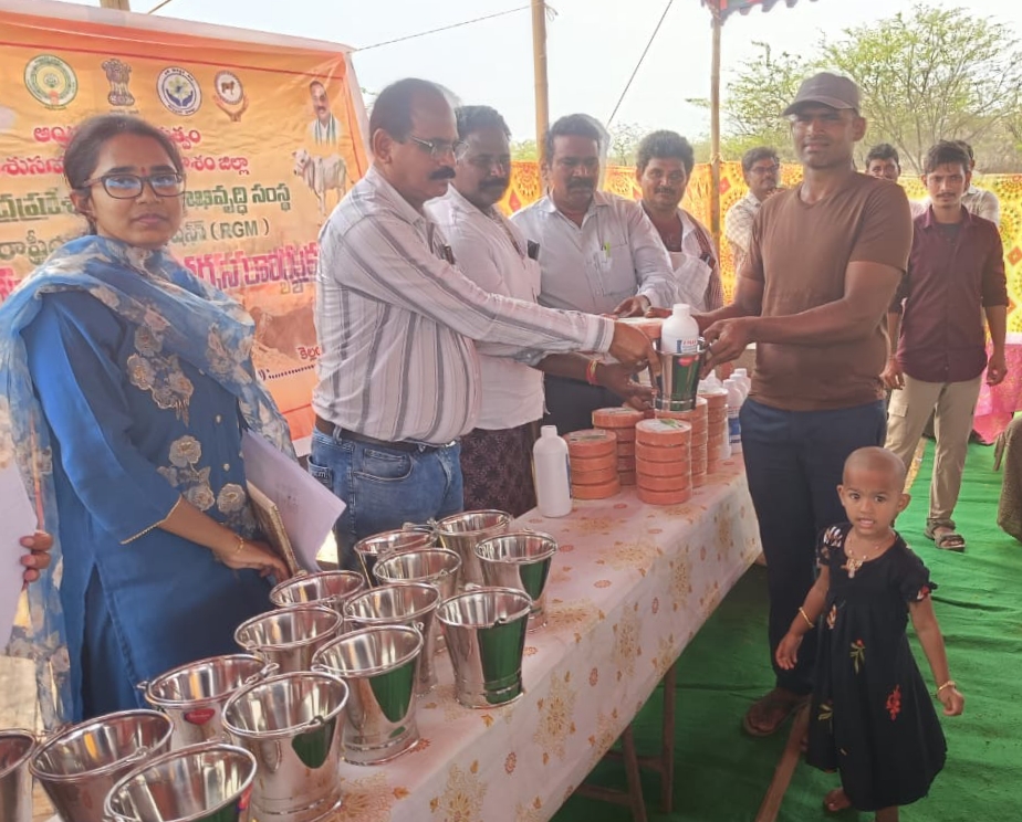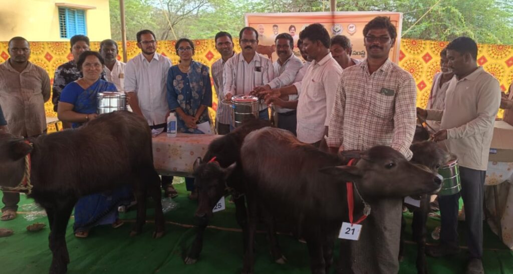 పశుపోషకులు దూడలు పెంపకంలో పలు జాగ్రత్తలు పాటించాలని జిల్లా ఎగ్జిక్యూటివ్ అధికారి పశుగణాభివృద్ధి సంస్థ డాక్టర్ బి మురళీకృష్ణ అన్నారు. మండలంలోని కె ల్లంపల్లి గ్రామంలో సోమవారం పశుసంవర్ధక శాఖ ఆధ్వర్యంలో జిల్లా పశుగణాభివృద్ధి సంస్థ సౌజన్యంతో మేలు జాతి లేక దూడల అందాల పోటీలు నిర్వహించారు. ఈ కార్యక్రమం ముళ్ళమూరు పశువైద్యాధికారిని ఎం విజయలక్ష్మి అధ్యక్షతన జరిగినది. ఈ సందర్భంగా ఆయన మాట్లాడుతూ దూడల పెంపకంలో తీసుకోవాల్సిన జాగ్రత్తల గురించి పశుపోషకులకు తెలియజేశారు. నట్టల నివారణ మందులు, లివర్ టానిక్, మరియు దూడల పోషణకు కావాల్సిన మినరల్ బ్రిక్స్ పంపిణీ చేశారు. ఈ పశు వైద్య శిబిరంలో 52 దూడలకు పోటీలు నిర్వహించారు. అందులో మూడు మేలు జాతి దూడలకు ప్రధమ, ద్వితీయ, తృతీయ, బహుమతులు అందజేయడం జరిగింది. అదే విధంగా రైతులకు ప్రత్యేక బహుమతులు అందజేశారు. ఈ కార్యక్రమంలో దర్శి సహాయ సంచాలకులు ఏ పురుషోత్తమ రాజు, మారెళ్ళ, తాళ్లూరు, పశు వైద్యాధికారులు ఎం కాశిరెడ్డి, వి ప్రతాపరెడ్డి, ఏ హెచ్ ఏ నరేంద్ర, జేవివో జి కిరణ్, తదితరులు పాల్గొన్నారు.
