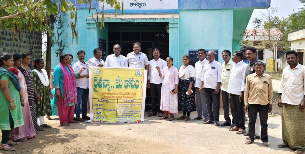 రైతన్న మీకోసం వారోత్సవాలను తాళ్లూరులో సో మవారం ప్రారంభించారు. రైతులకు నీరు, విత్తనం, ఎరువులు, సాంకేతికత, యంత్ర పరికరాలు, వ్యవసాయ రుణాలు, మార్కేటింగ్, ఫుడ్ ప్రాసెసింగ్, పరిహారం అన్నింటిని నమగ్ర రూపంలో అందించటమే ప్రభుత్వ లక్ష్యంగా పనిచేస్తుందని వక్తలు అన్నారు. జెడ్పీటీసీ మారం వెంకట రెడ్డి, తహసీల్దార్ బి వి రమణా రావు, వ్యవసాయాధికారి ప్రసాద రావు, ఏపీఎం దేవరాజ్, మాజీ సొసైటీ అధ్యక్షుడు పులి ప్రసాద్ రెడ్డి, టిడిపి నాయకుడు ఇడమకంటి సుబ్బా రావు, సుబ్బా రావు తదితరులు పాల్గొని కార్యక్రమాన్ని ప్రారంభించారు. వారోత్సవాలు ప్రతి గ్రామంలో నిర్వహించి రైతులకు ప్రభుత్వం అందిస్తున్న చేయూత, పథకాల గురించి వివరించటం జరుగుతుందని వ్యవసాయాధికారి ప్రసాద రావు తెలిపారు.