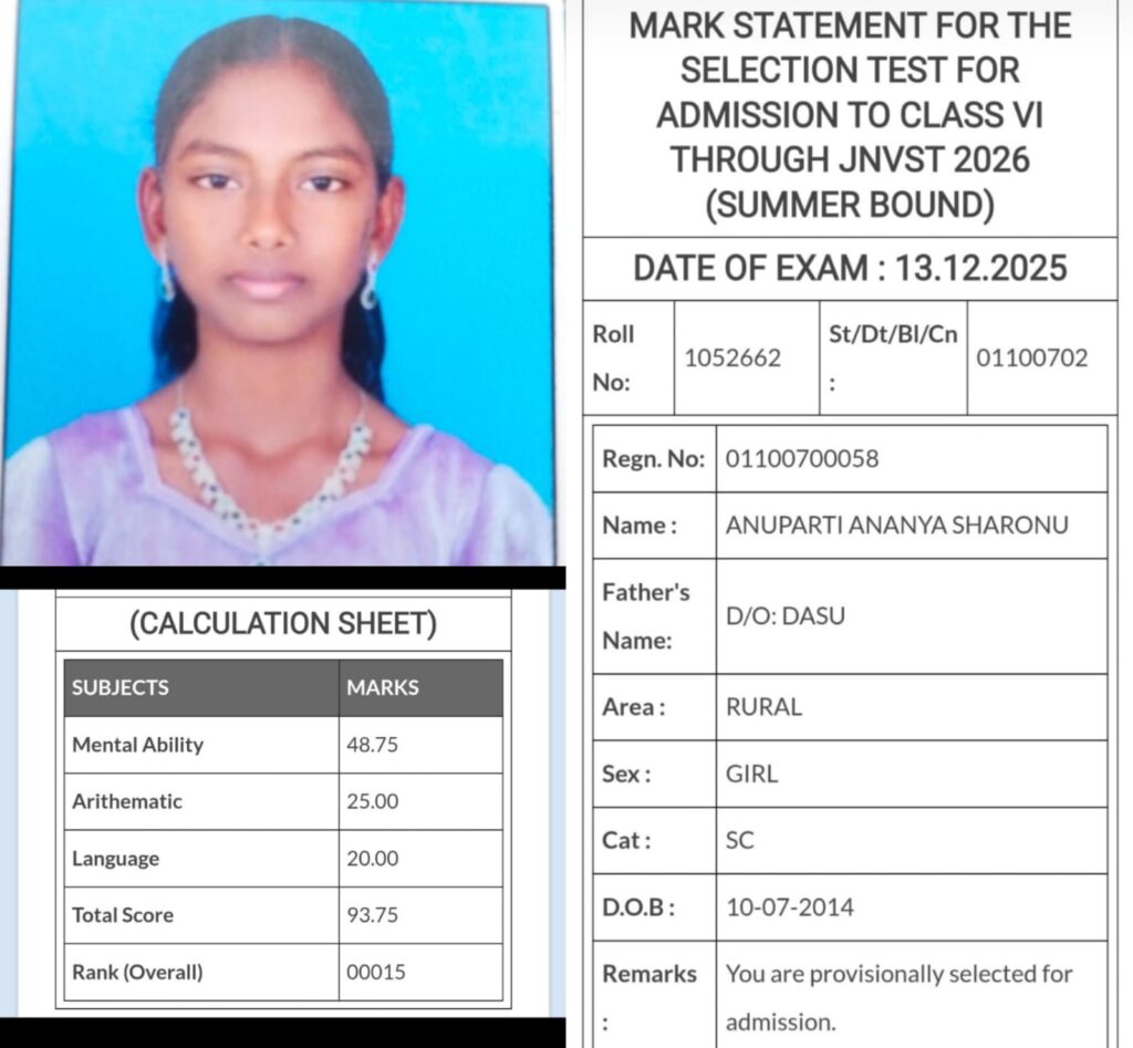 తాళ్లూరులోని ఏబీసీ స్కూల్ నందు చదువుతున్న అనపర్తి అనన్య 2026 నవో దయ ప్రవేశ పరీక్ష ఫలితాల్లో అధిక మార్కులు పొంది 15వర్యాంక్ సాధిం చారు. 5వతరగతి ఏబీసినందుచదువుతూ కోచింగ్ కి వెళ్లింది. నవోదయలో మం చిర్యాంక్ సాధించటం పట్ల ఆవిద్యార్థి అనన్యను ఏబీసీ కరస్పాండెంట్ తూము శ్రీనివాసరెడ్డి, స్కూల్ ప్రిన్సిపల్ కె.వెంకటే శ్వరరావు, డైరెక్టర్ కాలేషాబాబులు అభినందించారు. అనన్య తండ్రి దాసు తాళ్లూరు విద్యుత్ సబ్స్టే స్టేషన్ లో షిప్ట్ ఆపరేటర్ గా పనిచేస్తున్నారు. ఉత్తమ ర్యాంకు సాధించిన విద్యార్థి కి, అందుకు ప్రోత్సహించిన తల్లిదండ్రులను బంధుమిత్రులు అభినందించారు.
