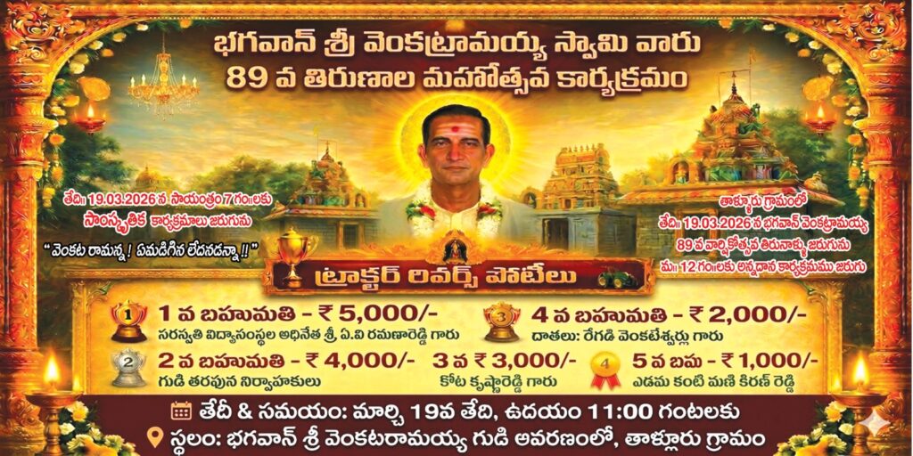19న భగవాన్ వెంకట్రామయ్యస్వామి తిరునాళ్లు. .ఏర్పాట్లను పూర్తిచేసిన నిర్వాహక కమిటీ – ట్రాక్టర్ల రివర్స్ పోటీల కు ఏర్పాట్లు