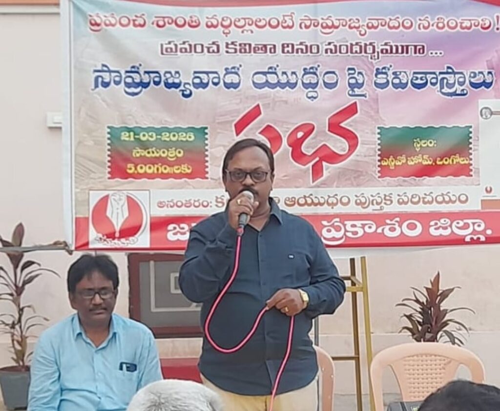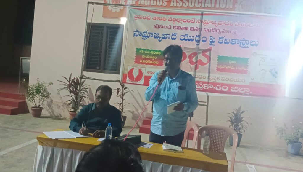 ప్రకాశం జిల్లా కమిటీ జనసాహితి ఆధ్వర్యంలో శనివారం ఒంగోలు ఎన్జీవో హోంలో సామ్రాజ్యవాద యుద్ధంపై కవితాస్త్రాలు సంధించారు కవులు.
