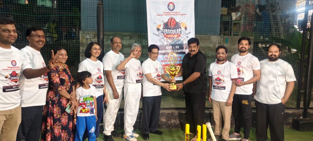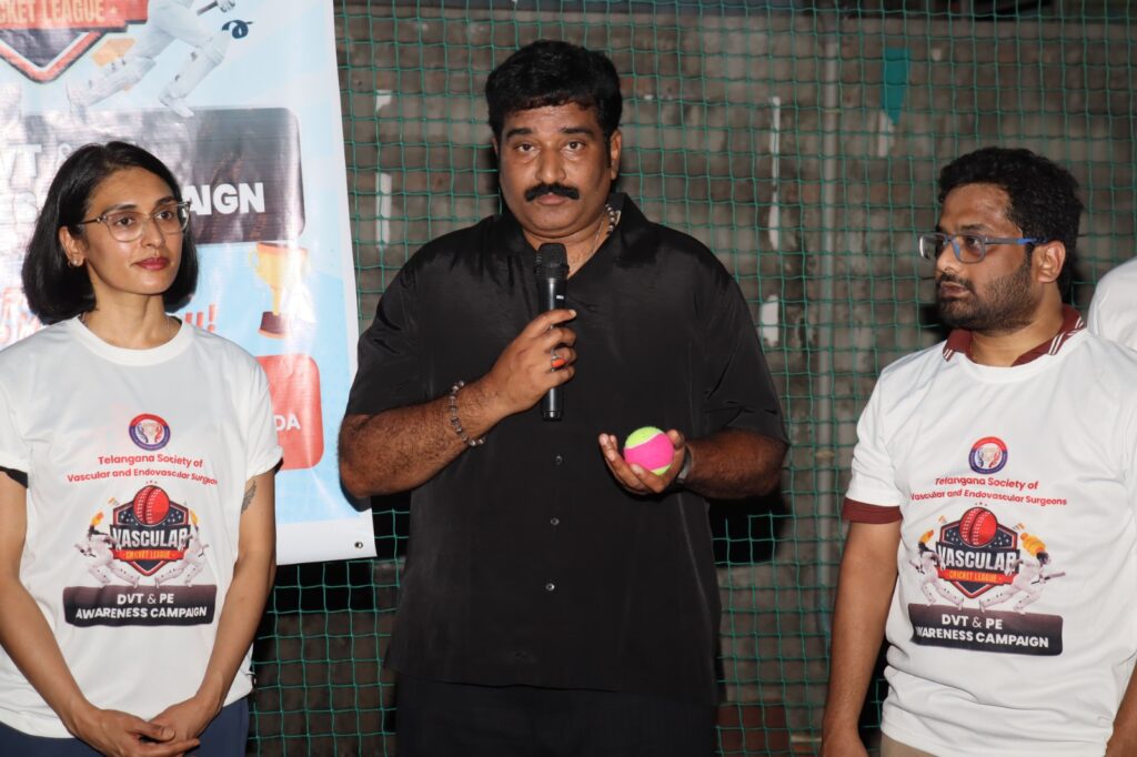 తెలంగాణ సొసైటీ ఆఫ్ వాస్క్యులార్ అండ్ ఎండోవ్యాస్క్యులార్ సర్జన్స్ ఆధ్వర్యంలో డివిటి (డీప్ వీన్ థ్రాంబోసిస్) మరియు పిఎఫ్ (ఫల్మనరీ ఎంబోలిజం) కాళ్ల నరాల్లో సమస్యలపై అవగాహన కల్పిస్తూ క్రికెట్ లీగ్ కార్యక్రమాన్ని నిర్వహించారు. నగరవ్యాప్తంగా ఉన్న వ్యాస్క్యులార్ సర్జన్స్ కలిసి ఏర్పాటుచేసిన తెలంగాణ సొసైటీ ఆఫ్ వ్యాస్క్యులార్ అండ్ ఎండోవాస్క్యులార్ సర్జన్స్ ఆధ్వర్యంలో ఆదివారం మణికొండలోని లేక్సైడ్ లీగ్ స్పోర్ట్స్ క్యాఫే వద్ద అవగాహన కార్యక్రమాన్ని ఏర్పాటుచేశారు. ప్రతి ఒక్కరు రోజు శారీరక వ్యాయామం ఉండాలని, కాళ్లల్లో వాపులు, నరాల్లో బ్లడ్ క్లాట్స్ వంటి సమస్యలు తలెత్తితే వెంటనే వ్యాస్క్యులార్ సర్జనన్ను కలిసి తగిన చికిత్స తీసుకోవాలని తెలియజేస్తూ ఫ్రెండ్లీ క్రికెట్ మ్యాచ్ నిర్వహించారు. ఈ అవగాహన కార్యక్రమానికి సినీ నటుడు రాజీవ్ కనకాల ముఖ్య అతిధిగా హాజరయ్యారు. డాక్టర్లతో కలిసి సరదాగా క్రికెట్ ఆడారు. ఈ సందర్భంగా రాజీవ్ కనకాల మాట్లాడుతూ ప్రతి ఒక్కరు ఆరోగ్యం పట్ల శ్రద్ధ వహించాలని, డివిటి అండ్ పిఎఫ్ సమస్య తీవ్రమైందని, ఏమాత్రం నిర్లక్ష్యం చేసినా కాళ్లను కోల్పోవాల్సి ఉంటుందని, ప్రాథమిక దశలోనే డాక్టర్ ను సంప్రదించి తగిన చికిత్సతీసుకోవాలన్నరు.