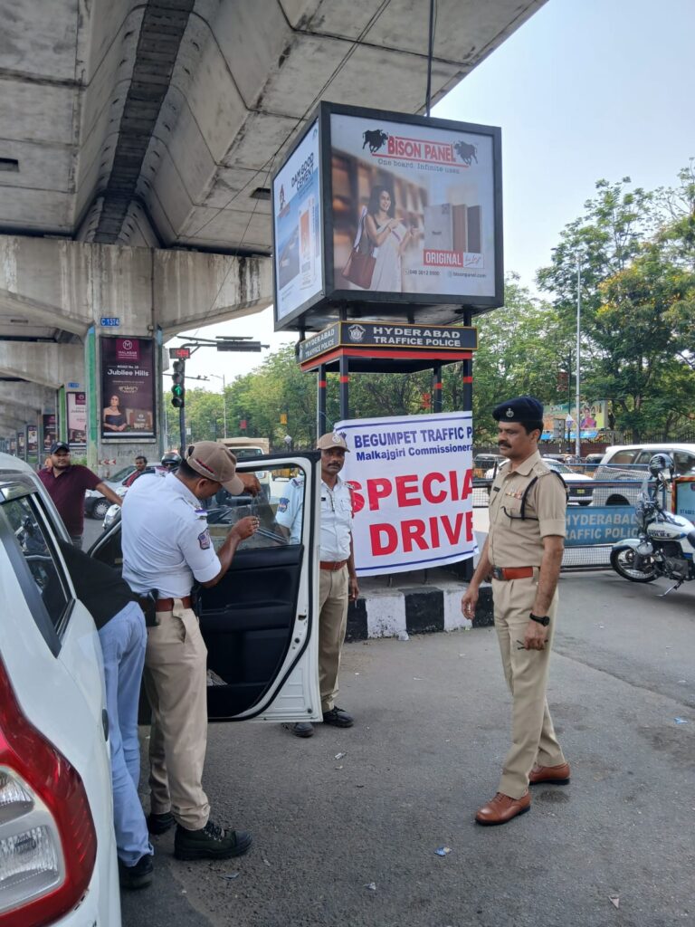 మల్కాజ్గిరి పోలీస్ కమిషనర్ ఆదేశాల మేరకు మల్కాజ్గిరి ట్రాఫిక్-I డిసిపి కె. రాహుల్ రెడ్డి సూచనలతో మంగళవారం బేగంపేట ట్రాఫిక్ పోలీస్ స్టేషన్ పరిధిలో మల్కాజ్ గిరి అదనపు డిసిపి షాకీర్ హుస్సేన్, తిరుమలగిరి డివిజన్ ట్రాఫిక్ ఏసిపి జి.శంకర్ రాజ్ ఆధ్వర్యంలో ఈ తనిఖీలు నిర్వహించారు. అధిక శబ్ద కాలుష్యం కలిగిన సైలెన్సర్ల,నంబర్ ప్లేట్ ఉల్లంఘన, రాంగ్ సైడ్ డ్రైవింగ్, సెల్ ఫోన్ డ్రైవింగ్, డ్రైవింగ్ లైసెన్సులు లేకుండా వాహనం నడపడం ట్రాఫిక్ వంటి వివిధ ఉల్లంఘనల పై బేగంపేట ట్రాఫిక్ పోలీసులు ప్రత్యేక డ్రైవ్ నిర్వహించారు. మల్కాజ్గిరి కమిషనరేట్ బేగంపేట్ ట్రాఫిక్ పోలీస్ స్టేషన్ పరిధి ముఖ్య ప్రాంతాలలో వాహనదారులు, ప్రజల భద్రత చర్యలలో భాగంగా హెచ్పిఎస్ అవుట్గేట్, రసూల్పురా, సిటిఓ జంక్షన్, బోయిన్ పల్లి వద్ద టింటెడ్ గ్లాస్/బ్లాక్ ఫిల్మ్పై ఈ ప్రత్యేక డ్రైవ్ ను చేపట్టారు.ఈ సందర్భంగా టింటెడ్ గ్లాస్/బ్లాక్ ఫిల్మ్ కలిగి వున్న 150 వాహన యజమానులపై కేసులు నమోదు చేసినట్లు ట్రాఫిక్ పోలీసులు తెలియజేశారు. ఈ తనిఖీల్లో బేగంపేట్ ట్రాఫిక్ ఇన్స్పెక్టర్ జి.జానకి రాముడు, సబ్ ఇన్స్పెక్టర్లు ఇ. హరీష్ గౌడ్, శివరాజ్, అశోక్ రెడ్డి, దేవిదాస్, సతీష్, ట్రాఫిక్ కానిస్టేబుల్,సిబ్బంది తదితరులు పాల్గొన్నారు.